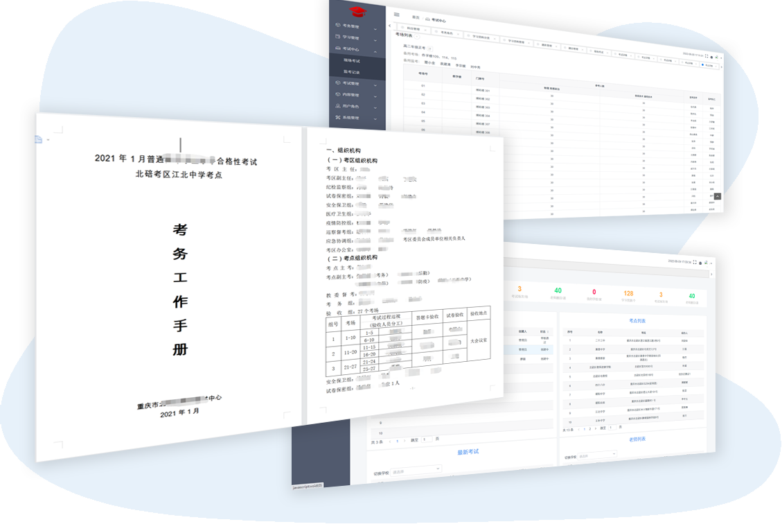 • 快捷的考場生成和安排功能,可幫助考式中心、考點快速安排考場和監考老師。